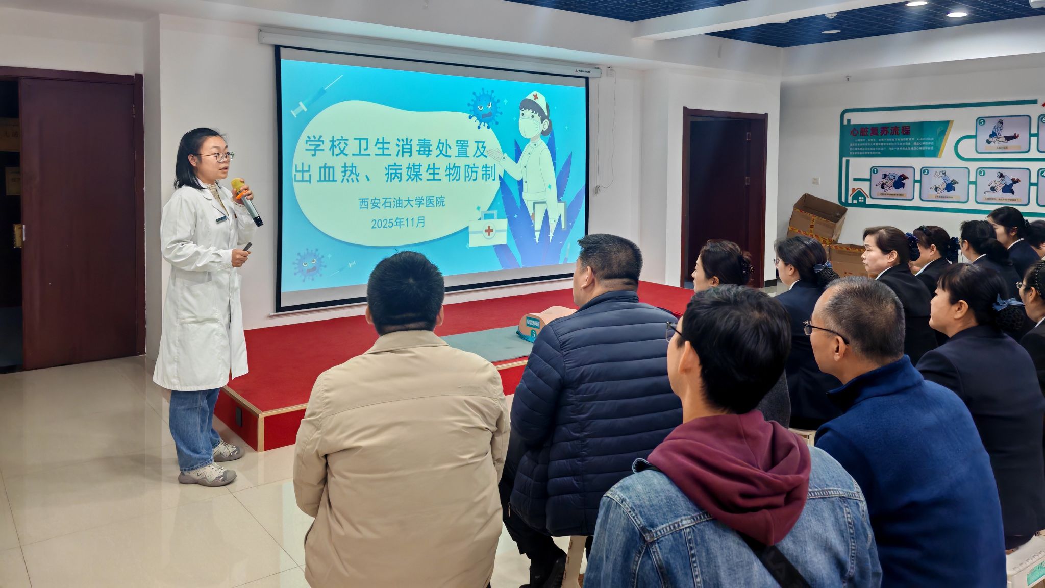 为全面提升校园应急保障能力,筑牢师生生命安全防线,夯实幸福西石大建设的安全根基,推动第三批“急救校园”建设落地见效,2025年11月5日下午,西安市鄠邑区红十字会、校工会与校医院联合开展第二期教职工应急救护专项培训,40余名教职工(以后勤工作人员为主)踊跃参与,以专业赋能注入安全动能。同步开展学校卫生消毒处置及出血热、病媒生物防治科普讲座,以专业赋能全方位筑牢校园安全防线。