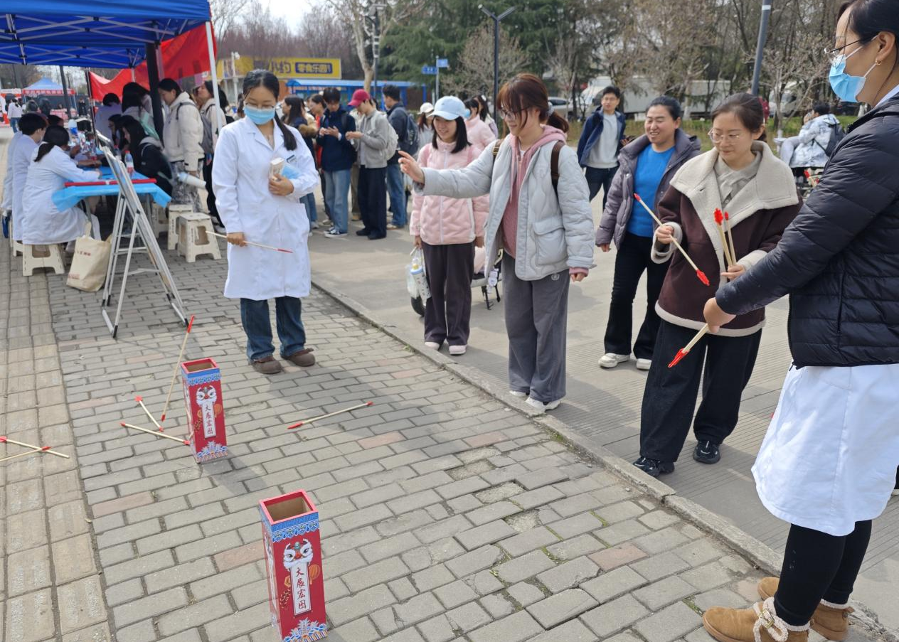 3月6日中午,鄠邑校区以“关爱女性健康,从呵护身心开始”为主题的专场健康咨询在东区食堂对面举行。通用环球中铁西安医院王娜娜、任朝伟、员海娟,及校医院王凯、李佳晨、齐琳婧等专家组成健康咨询团队,提供女性常见病咨询、中医体质辨识、内分泌调理、肿瘤预防等服务。现场开设血压、血糖免费检测点,校医院急救教育团队聚焦校园场景普及心肺复苏与海姆立克急救法,践行“人人学急救,急救为人人”理念。活动增设趣味小游戏与健康知识问答环节,为参与者发放精美小礼品,现场氛围温馨热烈、秩序井然。
