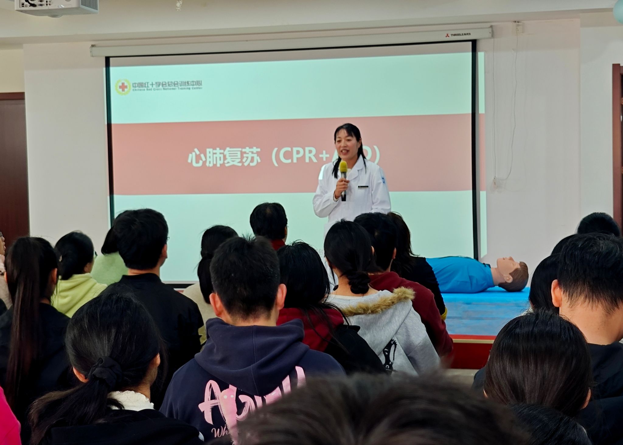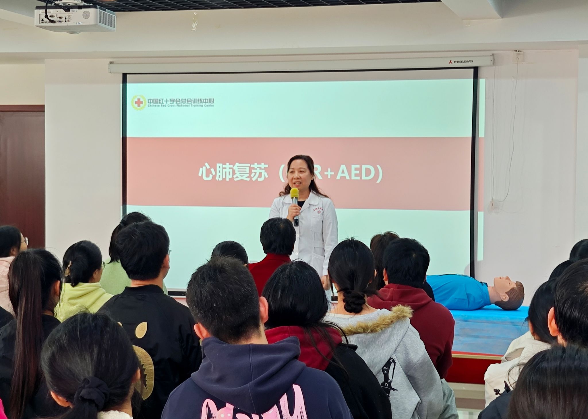 校医院急救负责人伍晓燕主任详细介绍了培训安排。本次培训采用“理论精讲+实操演练+考核认证”一体化模式,重点围绕心肺复苏、AED操作、气道异物梗阻急救等核心技能开展教学,由校医院专业急救团队全程授课指导,确保培训过程规范、内容高效、成果实用。