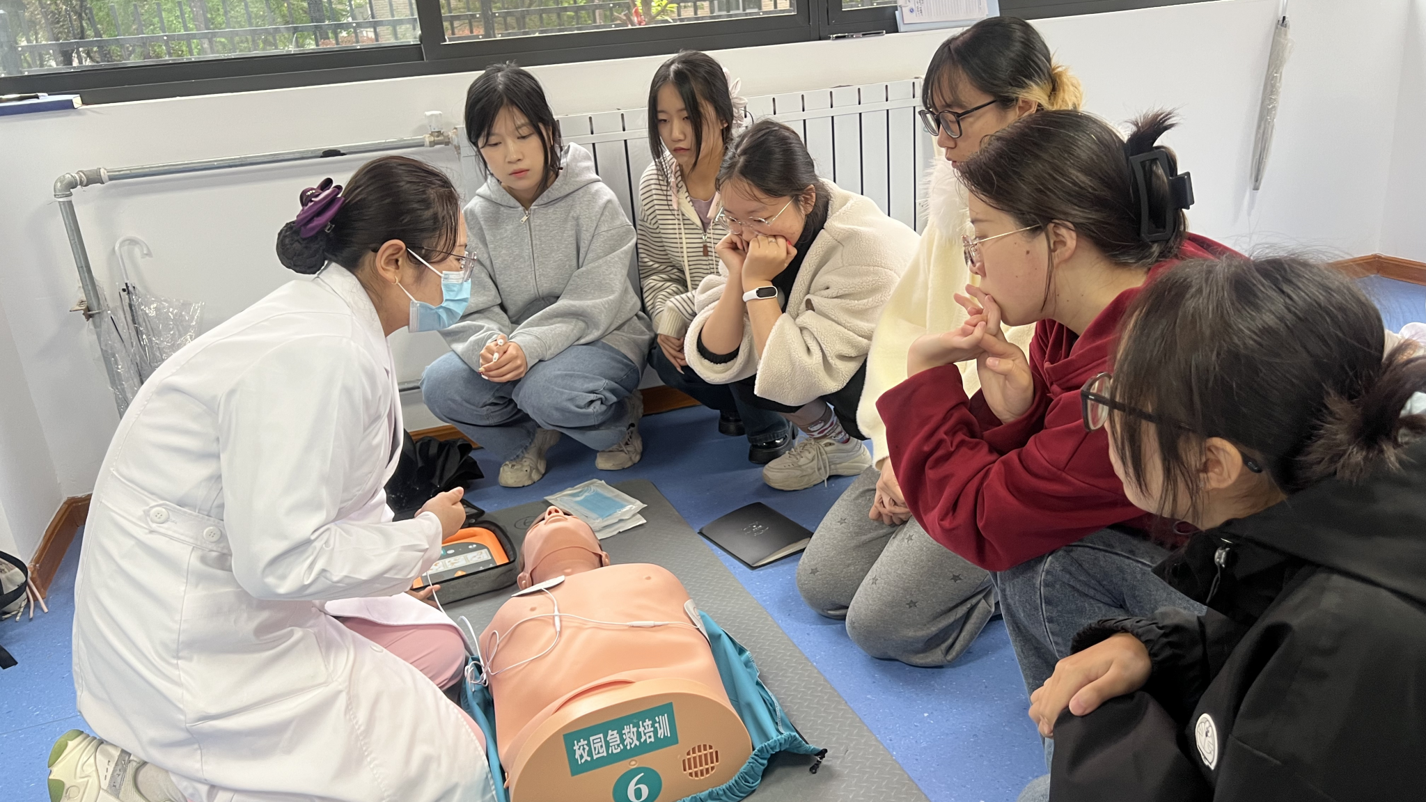 理论授课环节,校医院急救团队吴银娜讲师结合校园真实急救案例,用通俗易懂的语言,系统讲解心肺复苏(CPR)、AED操作、海姆立克急救法三大核心急救知识,细致拆解操作流程、明确关键注意事项、纠正常见急救误区,为参训师生夯实专业理论基础。实操演练中,全体师生分组展开练习,讲师借助心肺复苏模拟人、AED训练机等专业设备,逐一指导按压手势、发力节奏等动作细节,现场纠正操作偏差,确保每位学员掌握规范急救技能。