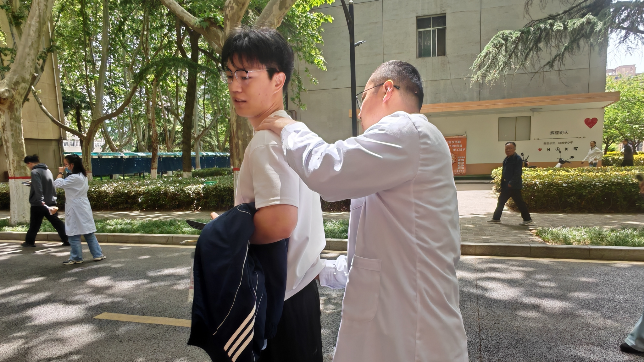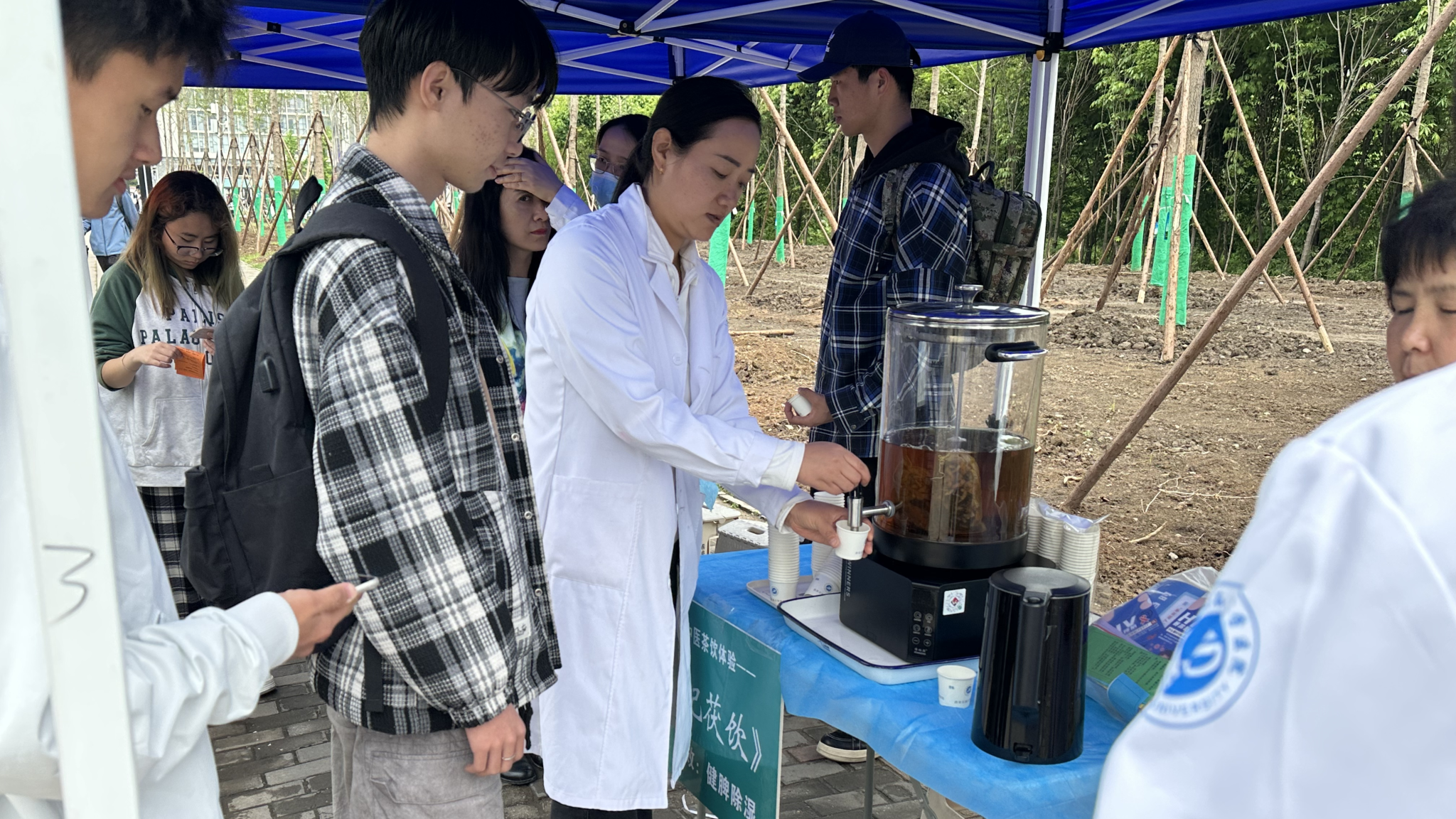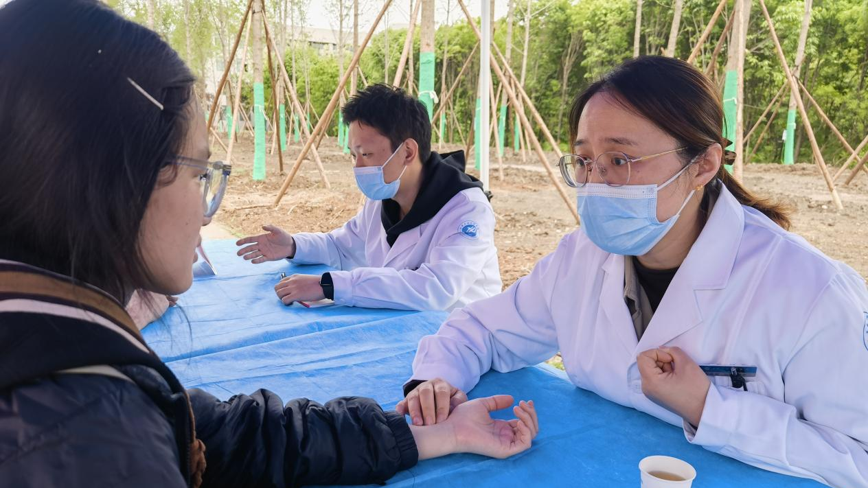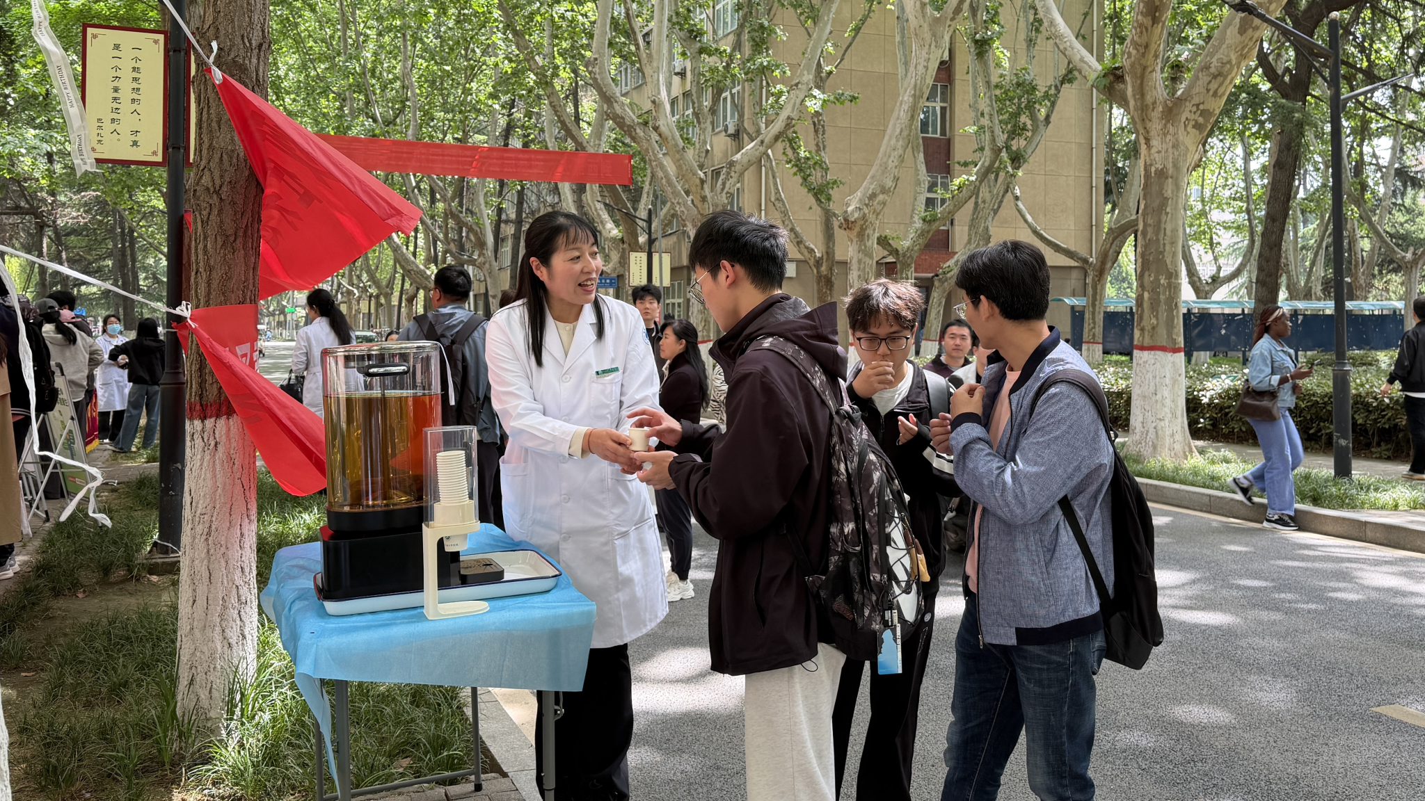 4月22日中午,鄠邑校区东区食堂前专场健康义诊活动顺利开展。活动现场,中医科医师坐诊为师生免费把脉问诊,耐心解答各类健康咨询,细致科普中医养生保健常识;药房精心配制的特色养生茶饮温润适口,工作人员现场讲解药材养生功效,为师生送上暖心健康关怀,茶饮获得广泛好评。与此同时,防保科工作人员面向师生,深入宣讲校园常见传染病防控知识,解读HPV疫苗优惠接种政策;护理部专业人员现场演示心肺复苏、AED规范操作等应急急救技能,并手把手指导师生实操练习,有效提升了师生突发状况应急处置能力。